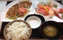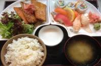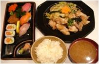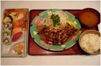 teriyaki chicken or beef, assorted (A) sushi / (B) sashimi, miso soup and rice