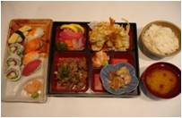 yakiniku beef, prawn tempura, teriyaki chicken, assorted sushi & sashimi, miso soup and rice