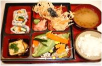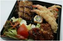 prawn tempura, gyoza, teriyaki chicken or beef, sushi roll, miso soup and rice