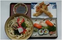 prawn tempura with udon noodle in soup and assorted (A) sushi / (B) sashimi