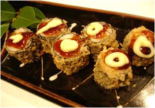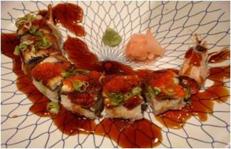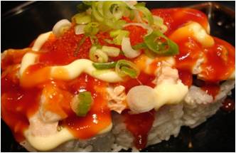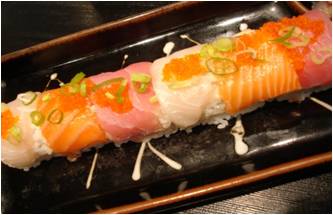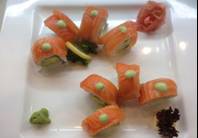 ocean fresh salmon sashimi on avocado roll with wasabi mayonnaise