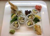 deep fried roll with prawn tempura, avocado, cucumber and carrot filling